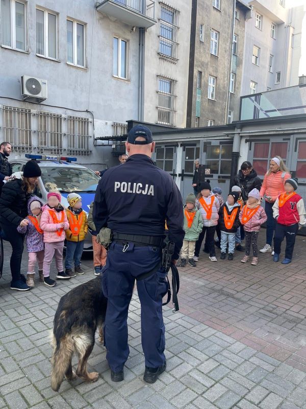Podczas wizyty przedszkolaki miały okazję zapoznać się z policyjnym wyposażeniem oraz odwiedzić wybrane pomieszczenia komendy. Duże zainteresowanie wzbudziła prezentacja radiowozu pogotowia wypadkowego, gdzie zaprezentowano specjalistyczne wyposażenie wykorzystywane podczas zdarzeń drogowych. Dzieci spotkały się także z przewodnikiem psa służbowego i dowiedziały się, jak wygląda praca psa policyjnego w terenie.