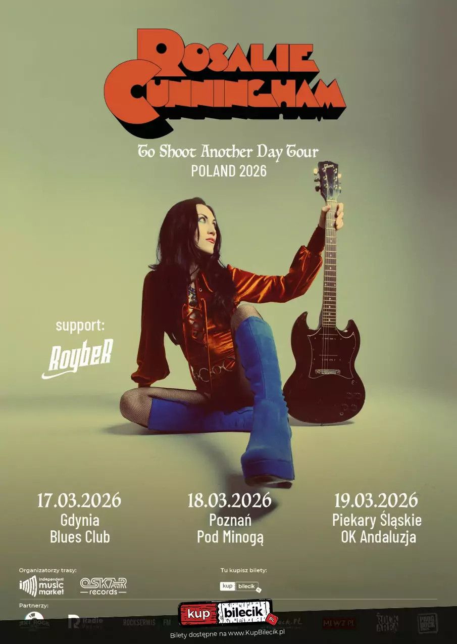 Rosalie Cunningham - jedna z najbardziej charyzmatycznych i oryginalnych postaci współczesnej sceny rockowej - tej wiosny w Polsce! Po świetnie przyjętych albumach Rosalie Cunningham, Two Piece Puzzle i najnowszym To Shoot Another Day, a także trasach koncertowych po całej Europie, artystka wraz ze swoim zespołem rusza w kolejną podróż, by oczarować publiczność swoim wyjątkowym brzmieniem i sceniczną energią.Trasa To Shoot Another Day Tour to trzy wyjątkowe koncerty w Polsce, podczas których usłyszymy utwory z nowego albumu, a także wcześniejsze klasyki, które ugruntowały jej pozycję wśród najbardziej cenionych twórczyń rocka progresywnego i psychodelicznego.