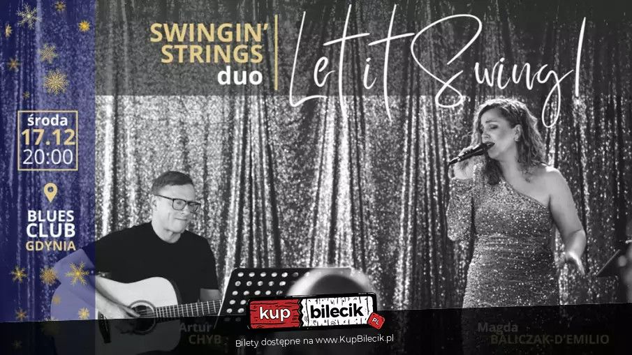 | Christmas Songsdodano 2025-09-30 19:15:18 Bożonarodzeniowy koncert pełen jazzu, ciepła i magii Świąt!  Usłyszycie m.in. takie hity jak Let it Snow, Winter Wonderland i wiele innych - tym razem w wyjątkowych, swingujących aranżacjach. W programie znajdą się również najbardziej ukochane jazzowe standardy - utwory, które od lat podbijają serca fanów jazzu na całym świecie, a które w wykonaniu Swingin" Strings Duo nabierają świeżości, elegancji i wyjątkowego klimatu. To wieczór, podczas którego magia Świąt spotyka jazzowe brzmienia. Kameralna atmosfera, ciepłe dźwięki gitary, zmysłowy wokal i świąteczne światła stworzą przestrzeń, w której każdy z nas poczuje, że święta są naprawdę blisko. Jeśli szukasz chwili wytchnienia, pragniesz poczuć świąteczny klimat, lub chcesz spędzić czas przy muzyce, która koi i zachwyca w miłym towarzystwie - ten koncert jest właśnie dla Ciebie! "Let it Swing" - podaruj sobie wieczór, który ogrzeje duszę i wprowadzi Cię w magię zbliżających się Świąt.Bilety do nabycia na: KupBilecik.pl Swingin" Strings Duo artyści:Artur Chyb, Magda Baliczak To energetyczny duet, który przeniesie Was w świat klasycznego, rytmicznego swingu, jednocześnie dodając świeżości i nowoczesnego brzmienia dobrze znanym hitom muzyki rozrywkowej. Magda Baliczak i Artur Chyb mistrzowsko łączą elegancję i charyzmę dawnych lat z przebojowością, której oczekuje współczesna publiczność. To muzyczna podróż przez dekady największych hitów - od wyjątkowego Franka Sinatry po niespodziewane covery utworów takich artystów jak Michael Jackson, Dua Lipa czy Amy Winehouse - wszystko w tanecznych, swingowych rytmach. Bilety do nabycia na: KupBilecik.pl |