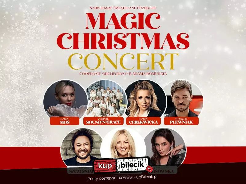 bilety: Zapraszamy na magiczny, spektakularny i otulający koncert największych świątecznych hitów w przepięknych orkiestrowych aranżacjach. Uwielbiane zimowe utwory wykonają wybitni, utalentowani artyści. Magic Christmas Concert artyści: Kasia Moś, Kasia Cerekwicka, Ewelina Lisowska, Mietek Szcześniak, Staszek Plewniak i inniZapraszamy na magiczny, spektakularny i otulający koncert największych świątecznych hitów w przepięknych orkiestrowych aranżacjach. Uwielbiane zimowe utwory wykonają wybitni, utalentowani artyści. Nastrojowa oprawa wizualna wypełni przestrzeń i będzie wspaniałym tłem dla niezwykłego muzycznego przeżycia. Wsłuchaj się w głosy wyjątkowych artystów i daj się przenieść do niezwykłej krainy świątecznej symfonii. Bilety do nabycia na: KupBilecik.pl |